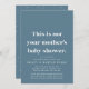 Os tempos modernos exigem um convite ao chá de fraldas moderno. Se você está fazendo a festa online devido ao distanciamento social, este é um convite perfeito para você. O texto ousado e lúgubre diz "Este não é o chá de fraldas da sua mãe" com ênfase em não, e os detalhes da parte abaixo incluem espaço para informações sobre reuniões sociais online, registro, informações de envio e muito mais junto com os detalhes da parte. A parte traseira apresenta um padrão de ponto lúdico. A cor azul empoeirada moderna é o padrão, mas pode ser alterada clicando em "personalizar mais". Excelente para chás de co-ed, chás de adoção e dois pais ou dois casais da mãe também - e qualquer um que aprecie seu senso de humor e sagacidade!