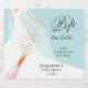 Essas etiquetas para garrafa de vinho espumante de chá de noiva azul-turquesa apresentam uma garrafa de vinho espumante rosa borrifando lantejoulas douradas e uma noiva no seu vestido e véu segurando uma taça de vinho espumante com os seus detalhes em letras elegantes. Altere a cor do fundo para combinar com a ocasião. ITENS COORDENADOS na nossa coleção.