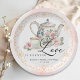 Sirva charme com este elegante prato de papel "O Amor está no Forno" para chá de noiva! Com uma xícara de chá e um bule de chá florais vintage, rosas cor de rosa e detalhes em pergaminho dourado, este design de aquarela suave é um lindo complemento para a sua mesa de chá de noiva. Personalizado com o nome da noiva e a data do chá, é a combinação perfeita de beleza e função para uma celebração elegante.