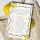 Adicione diversão ao tema principal do seu chá de panela de aperto com este jogo O que o noivo disse! Com um design de limão chic, é perfeito para uma celebração principal de limão chá de panela. Este jogo imprimível é um excelente adicional ao tema do seu chá de panela de limão, mantendo os hóspedes entretidos enquanto eles adivinham as respostas do noivo. Ideal para as ideias de chás de panela com tema limão, ele se encaixa nas ideias de chá de panela com tema limão italiano e é um imperativo para as ideias de chá de panela de verão!
