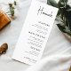 Menu moderno de casamento preto e branco com um layout minimalista com um nome de script na moda no topo para um toque chic personalizado. Perfeito para casamentos, chás de panela ou festas de noivado, este elegante design emparelha eterno monocromático com a tipografia contemporânea. Uma escolha versátil para celebrações modernas, desde jantas íntimas a recepções formais, criando um detalhe de jantar elegante e sofisticado.