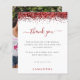 Chá de panela De Fotografia De Glitter Vermelho Orçamental Obrigado. Um alternativo de 4,5 pol x 5,6 pol com preço inferior. Disponível em um STOCK DE CARTÃO SEMI-GLOSS 110 lb, que é a opção padrão (mais espesso para convites), OU um STOCK de PAPEL THINNER FINISH 80 lb FINISH (ideal para gabinetes). Os envelopes são um extra opcional e são ligeiramente maiores que o tamanho da placa. Uma borda falsa com brilho em vermelho em negrito está no topo, e Obrigado está em um roteiro elegante. Personalize facilmente o texto para seus próprios detalhes. Na parte de trás troque sua foto favorita do seu chá de orientação para retratos.