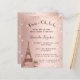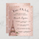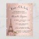 Um convite moderno, na moda e glamouroso para um tema chá de panela e parisiense. Um fundo rosa de gradiente dourado com faíscas falsas e a torre Eiffel com algumas flores. O nome é escrito com um moderno estilo escrito à mão. Personalize e adicione um nome e detalhes da parte.