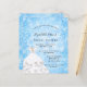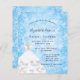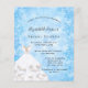 Para um Chá de panela elegante e glamouroso. Um fundo azul de floco de neve. Decorado com um vestido branco para uma festa de maravilha do inverno. Personalize e adicione um nome, idade e detalhes da festa. O nome é escrito com um script de estilo manuscrito