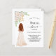 Um fundo branco. Uma noiva, flores brancas e verde. Personalize e adicione um nome e detalhes da parte. 1 folha = 1 convite impresso de borda a borda.
