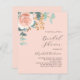 Um fundo cor de pêssego da moda. Decorados com ouro-rosa e folhas de eucalipto cor-de-rosa-esbranquiçada, flores de rosa e cor-de-rosa-esbranquiçada, galhos, verde-verde e um cinzeiro de ouro falso. Personalize e adicione o nome da noiva a ser e os detalhes da festa. Fundo: fundo cor de pêssego. 1 folha = 1 convite impresso de borda a borda.