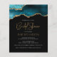Este convite de aniversário de tendências apresenta uma imagem de aquarela de um geode agado em tons de azul lacrimejado, cortada com realces de brilho dourado falsos. As palavras "Chá de panela" aparecem na falsa brilha dourada em letra decorativa moderna de escrita manual. Personalize-o com o nome da noiva a ser na fonte de deco de arte dourada e os detalhes do chá no tipo de serifa sans branco em um plano de fundo preto. A mesma imagem de coleira aparece no lado oposto.