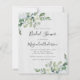 Convide amigos e familiares a honrarem a noiva a ser com este Chá de panela com barato com folhas de cor d'água eucalipto contra um fundo de madeira pálida.
