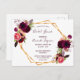 Um Chá de panela de estilo boho. Na frente: Um fundo branco com um quadro fino em forma geométrica dourada. Decorados com flores, rosas e penas do estilo "boho" escuras e burguesas. Modelos para o nome da noiva e detalhes da festa. O nome é escrito com um estilo escrito à mão, letras coloridas e brilhantes.