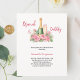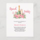 Um convite moderno, na moda e glamouroso para um Chá de panela de bolinho. Um fundo de cor branca com rosas cor-de-rosa, um frasco de vinho espumante e uma flauta. Personalize e adicione os detalhes da sua festa. 1 folha = 1 convite impresso de borda a borda.