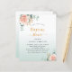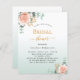 Fundo verde e gradiente branco. Decorados com ouro-rosa e flores cor-de-rosa, flores rosa e folhas de eucalipto, borras, verde e borras de ouro. Personalize e adicione o nome da noiva a ser e os detalhes da festa. Letras pretas e ouros coloridas. Traseiro: cor de fundo verde e gradiente branco. 1 folha = 1 convite impresso de borda a borda.