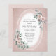 Rosas rosa poeirentas e Rosa de Eucalyptus, Chá de panela Floral de Ombre Dourado... Nosso chá de panela floral barato apresenta um fundo ombre brilhante de ouro escamoteado com buquês de rosas cor-de-rosa pastel e poeirentas e verde de eucalipto em um local oval que enquadra seu elegante texto de convite para tipografia. Todo texto de exemplo pode ser facilmente revisado com suas próprias informações sobre o modelo de personalização.