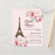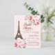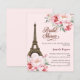 Um convite moderno, na moda e glamouroso para um tema chá de panela e parisiense. Um fundo cor-de-rosa suave, a torre Eiffel de Paris com rosas cor-de-rosa, flores. O nome é escrito com um moderno estilo escrito à mão. Personalize e adicione um nome e detalhes da parte. 1 folha = 1 convite de borda a borda.