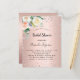 Um chá de panela glamouroso. Um fundo de aparência metálica falsa rosa dourado. Decorados com diamantes falsos cor-de-rosa e flores impermeáveis, floras em ouro branco e rosa com um pouco de verde. Personalize e adicione a noiva ao nome e aos detalhes da festa. Texto preto. Fundo: fundo rosa dourado e diamantes, design postal. Dica: Se você não quiser que pareça um cartão postal, clique em personalizar, vá para o verso e remova o divisor e o carimbo de posto.