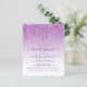 Um design moderno, chic, com um fundo ombre roxo com uma borda superior de pingos de brilho roxo. As palavras "chá de panela" e o nome da noiva a ser aparecem em um roteiro de caligrafia em minúsculas com traços decorativos no início e no fim, com o texto restante em fonte sans serif. O fundo ombre roxo e o limite de gotejamento com brilho são repetidos no sentido inverso. (Para guardar as hastes, substitua apenas as letras do nome da noiva, deixando os símbolos no lugar.)