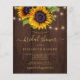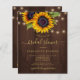 Chá de panela de convite para na moda de barato da festa chic country rustic country em um fundo de madeira marrom apresentando um buquê de girassóis dourados amarelo e um roteiro elegante de caligrafia dourada.+++++++++++Fácil de personalizar com seus detalhes! Você pode personalizá-lo alterando ainda mais as fontes e as cores das letras. +++++++++ O convite é adequado para as festas de verão ou outono ao ar livre, jardim, fazenda, celeiro, chás de panela de países rústicos no quintal, brunch ou almoço. +++++++++ LEIA ISTO ANTES DE COMPRAR! Este é um cartão de casamento de barato orçamentário impresso em uma folha de papel (cada folha tem um cartão). +++ Para obter a melhor qualidade de preço, nosso conselho é escolher o tipo de papel Semi-Gloss (é espesso o suficiente para ser usado para papelaria) +++ Se você precisar de envelopes, escolha a OPÇÃO ENVELOPE. ++ Verifique duas vezes todas as informações e a ortografia do seu texto porque você receberá exatamente o que você vê - ninguém mais verificará nada antes de imprimir. +++ Esta placa foi projetada para o tamanho de 4,5" x 5,6". Caso você escolha outro tamanho do cartão e o texto saia da página, tudo precisa ser corrigido antes de adicionar o produto ao carrinho. Peça ajuda ao Serviço de Design ao Vivo.
