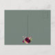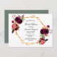 Na frente: um fundo branco elegante com uma estrutura geométrica dourada falsa. Decorados com flores, rosas e penas do estilo "boho" escuras e burguesas. Modelos para o nome da noiva e detalhes da festa. O nome é escrito com um script de estilo manuscrito, letras pretas. Volta: um cenário verde de sábio. Dica: Se você não quiser que pareça um cartão postal, clique em personalizar, vá para o verso e remova o divisor e o carimbo de posto.