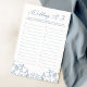 Adicione uma dose de elegância vintage ao seu chá de panela com o Jogo de Chá Floral A-Z da Chinoiserie Francesa Azul Chinoiserie! Este maravilhoso jogo apresenta designs florais lindíssimos, azuis e barrocos, franceses, para um toque do estilo da chinoiserie. Este maravilhoso jogo de chá de panela encoraja seus hóspedes a inventar uma palavra para cada letra do alfabeto relacionado ao amor, casamento e a relação da noiva e do noivo. Com certeza todos rindo e compartilhando boas memórias. Os motins chic, azuis e florais acrescentam um toque sofisticado. O Jogo A-Z do Chá Floral Francês Blue Chinoiserie é a atividade perfeita para um chá de panela de na moda ou chinoiserie tematizada. Tanto a noiva como os convidados adorarão este jogo maravilhoso!