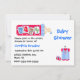 Um convite para chás de fraldas bonito, com uma garrafa de bebê branca, no topo, com texto gráfico lendo BABY. Um doce macacão listrado de garotinho e um par de pequenos tênis vermelhos decoram o fundo direito do convite. O texto é totalmente personalizável para atender às suas necessidades.