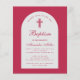 Um convite batismo para o batizado de uma menina. Numa cor moderna entre magenta e vermelho, tem um arco branco com dentro de texto vermelho magenta. A palavra Batismo e o nome são escritos num guião caligráfico elegante; a primeira linha é o texto arquivado.