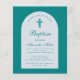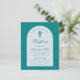 Um convite para o batismo moderno. Em um fundo azul lacrimogêneo, ele tem um arco branco com dentro de texto lacrimogêneo. A palavra Batismo e o nome são escritos num guião caligráfico elegante; a primeira linha é o texto arquivado.