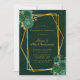 Design apresenta um elemento floral colorido impresso em tons de esmeralda verde e ouro. Texturas de canvas verde com falso quadro geométrico em ouro e florações de pedras com script de caligrafia em ouro ou escrevendo de tipo. Excelente para as comemorações do casamento!