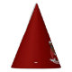 Um chapéu de festa com uma ilustração de um lindo sorridente garoto feliz com óculos, ele está vestindo fantasia vermelha e branca do Papai Noel e segurando um presente; com um modelo de texto editável para seu nome ou mensagem, design de Natal com fundo vermelho