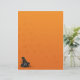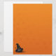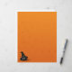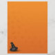 Feliz ilustração do Dia das Bruxas com um chapéu de bruxa com estrelas ouros e lua e uma aranha pendurada sobre um fundo laranja com formas de padrão de jack-o-lanterna.