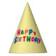 Uma variedade de letras coloridas formam as palavras Feliz Aniversário num chapéu de festa amarelo brilhante.