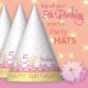 No topo do aniversário de 5 anos com um chapéu de festa de aniversário amarelo com uma borda floral cor-de-rosa e personalizado com o número 5 e o nome da aniversariante.