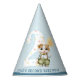 Comemore o segundo aniversário do seu filho com este bonitinho chapéu de festa de aniversário de gato. A design apresenta um gato segurando um balão amarelo. O fundo é um sutil padrão azul claro. Você pode personalizar este chapéu de festa com um nome.