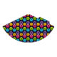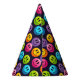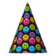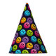 Um vibrante e lúdico convite de aniversário, com um design psíquico e inspirado por retrô. O fundo escuro é decorado com formas coloridas e giratórias, linhas de abstrato e gotas de cor vibrantes que lembram os anos 70. A fronteira é um padrão divertido de smileys face multicoloridos, com estrelas e bolhas espalhadas pelo design. O texto está em uma mistura de fontes ousadas e lúdicas, com detalhes-chave realçados em azul brilhante e rosa.