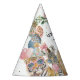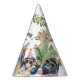 Party hat featuring a watercolor party animal design with a lion, jungle elements, and colorful confetti accents.