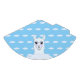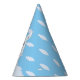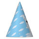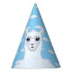 Lindo chapéu de festa de papel com um desenho de lhama linda e padrão de nuvem em fundo azul claro.