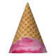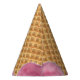 Chapéu de festa de aniversário com um cone de sorvete invertido, gotejando sorvete de morango no chapéu.