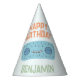 This sweet birthday party hat design features the lovable Slumberkins Hammerhead character with a cheerful smile and soft pastel blue tones that feel calm, friendly, and perfectly kid-focused. The playful “Happy Birthday” text arches above the character, while a customizable name below adds a fun personal touch that makes the celebration feel extra special. The clean layout and gentle color palette create a modern, soothing look that works beautifully for toddlers and young children, especially for ocean- or shark-themed birthday parties. This design is ideal for creating a coordinated, character-inspired celebration that feels joyful without being overwhelming.