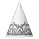This party hat is shown in a white background and a silver and pearl tiara print all the way around. Text in coordinating color of silver-gray states Happy New Year.