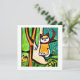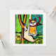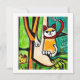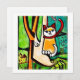 Un chat dans un arbre l’air dubitatif; une ville en arrière plan, dans un style naïf.