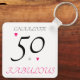 chaveiro de 50 anos personalizado, 50 e fabuloso escrito em cores rosa e pretas, com corações cor-de-rosa bonitos no design. você pode personalizar o nome, mudar as cores e o script.