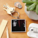 Um crânio mascarado vestido com uma capa preta encapuzada e uma mão enovelada negra convidando-o a vir. Uma cortina de marrom é usada como pano de fundo nesta foto. Isso está disponível em estilos e tamanhos variados de chaveiros.