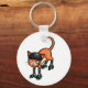 Um chaveiro com uma mesa cor de laranja, vestindo 2 pares de skates de roletes, meias de stripey preto e branco e um capacete de segurança.