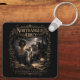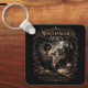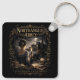 Uma heroína iluminada por velas do período Regencial olha para uma abadia sinistra iluminada pelo luar, cercada por livros antigos, uma caveira e molduras góticas ornamentadas em estilo de ilustração escura e rica.