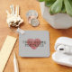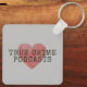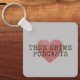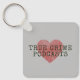 Um porta-chaves para amantes de true crime podcast em todo lugar, apresentando um coração de impressão digital vermelha com texto em estilo de máquina de escrever.