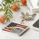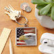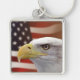 Chaveiro mostrada com a bandeira americana impressa sobre sobreposta com a águia-baleeira americana na frente. O chaveiro está amarrado em prata. Personalize este item ou comprar como está. Imagem do stock