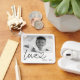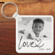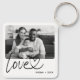 Colagem de fotos moderna com "amor" com chaveiro de coração conectado em letra cursiva.