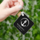 Um chaveiro moderno de temas náuticos para o vosso barco que ilustra branco uma âncora num círculo sobre fundo preto. Personalize com o nome e a localização do seu barco com uma tipografia branca simples.