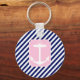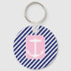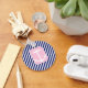 Esta design de papoila e fofinha tem uma silhueta branca de âncora em uma estrutura de rosa claro sobre um fundo de faixas azuis de marinho náutica, diagonal.