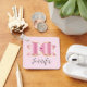 Chaveiro personalizado com um arco brilhante brilhante com contorno de ouro e uma pedra-pomes rosa facetada no centro. Estilo de luxo feminino.