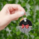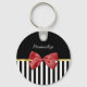 Um elegante chaveiro básico com listras verticais pretas e brancas, embelezado com uma fita colorida FAUX chic e uma imagem de um arco clássico do estilo fita vermelha. Personalize-o adicionando o nome daquela garota especial na sua vida. Imagem plana, NÃO metálica ou arco real.