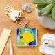 Arte abstrata colorida original de silhueta de senhora com desenhos de aquarela coloridos em azul e dourado.